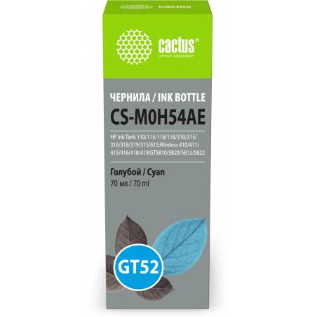 Чернила Cactus CS-M0H54AE GT52 голубой 70мл для HP Ink Tank 110/115/116/118/310/315/316/318/319/515/615Wireless 410/411/415/416