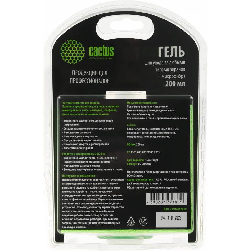 Чистящий набор (салфетки + гель) Cactus CS-S3004BL для экранов и оптики блистер 1шт 25х25см 200мл