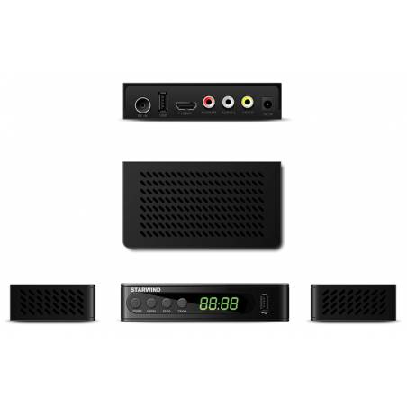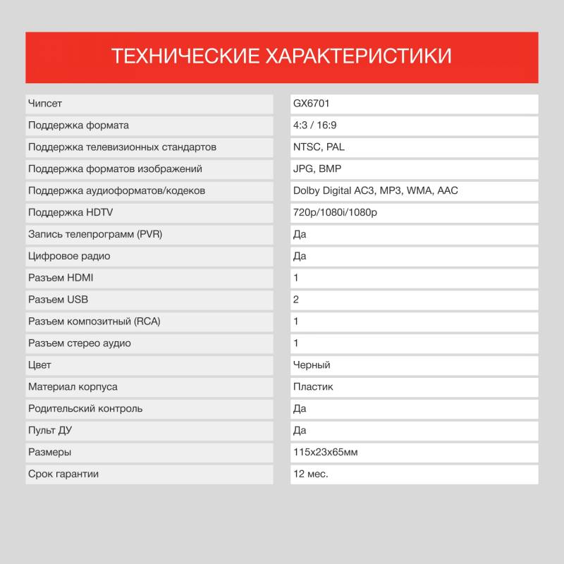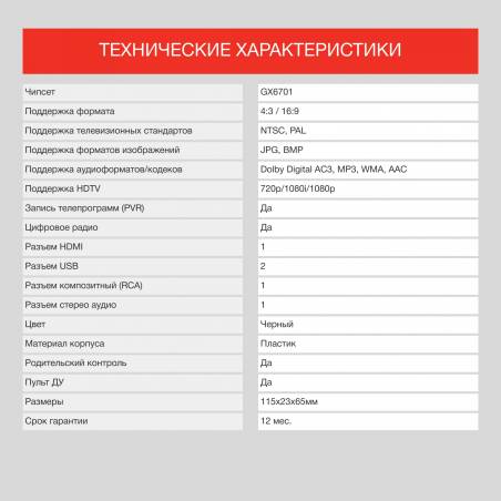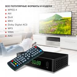 - кнопки управления на корпусе, дисплей (каналы или часы). При подключении к интернету (USB WiFi адаптер на чипсете MTK MT7601 приобретается отдельно) доступны YouTube, Погода, RSS новости, IPTV, MEGOGO. В комплекте: ТВ-ресивер, пульт ДУ и батарейки к н