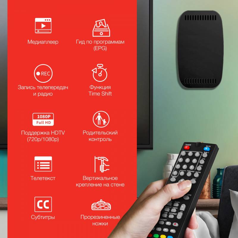 - при подключении к интернету (USB WiFi адаптер на чипсете MTK MT7601 приобретается отдельно) доступны YouTube, Погода, RSS новости, IPTV, MEGOGO. В комплекте: ТВ-ресивер, пульт ДУ и батарейки к нему, видеокабель RCA, блок питания, инструкция