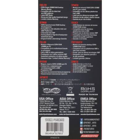 Память DDR4 8Gb 3600MHz Patriot PVS48G360C8 Viper Steel RTL Gaming PC4-28800 CL18 DIMM 288-pin 1.35В с радиатором Ret