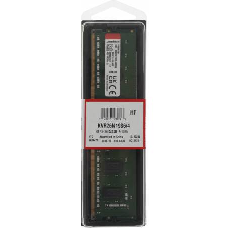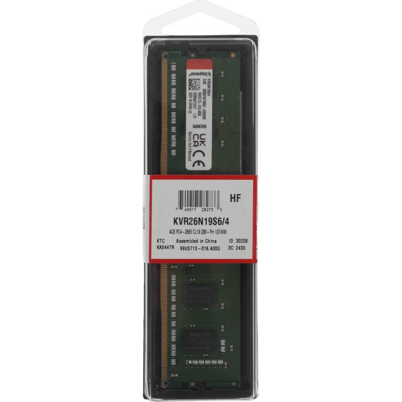 Память DDR4 4Gb 2666MHz Kingston KVR26N19S6/4 VALUERAM RTL PC4-21300 CL19 DIMM 288-pin 1.2В single rank Ret