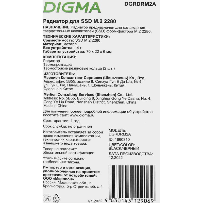 Радиатор для SSD Digma DGRDRM2A черный металл Ret