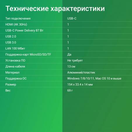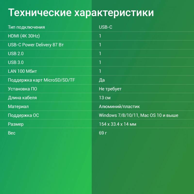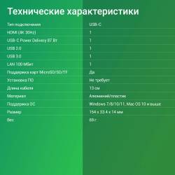 - Type-C док-станция DIGMA, 8 портов (HDMI (4K@30Hz, FULL HD@60Hz) , USB-C PD 87W, USB-C, SD/MicroSD, Lan 100mb, 1xUSB 3.0, 1xUSB 2.0