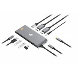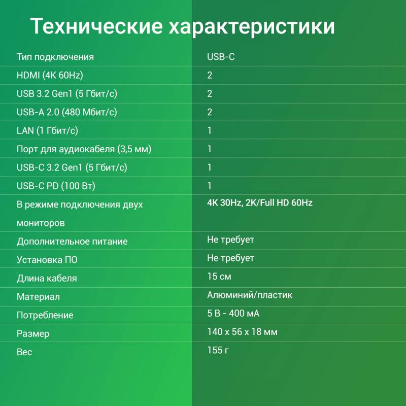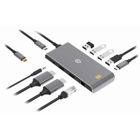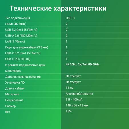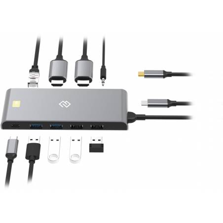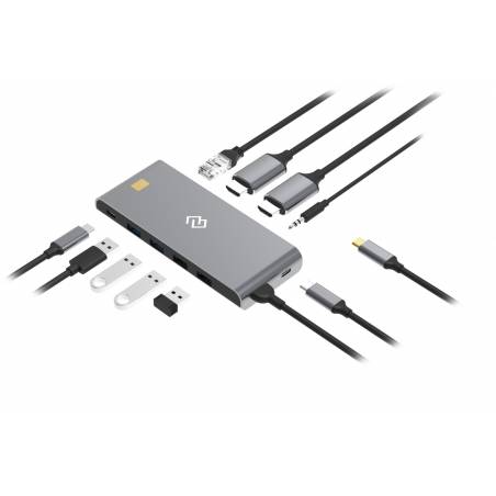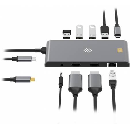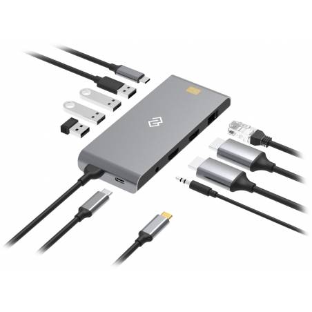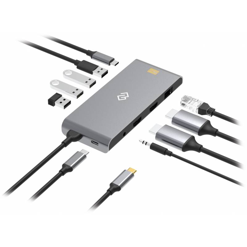 - Type-C док-станция DIGMA, 8 портов - 2x HDMI (up to 4K@60Hz, 2K/FULL HD@144Hz), 2x USB-A 3.2 Gen1 (5Gbps), 2x USB-A 2.0 (480Mbps), 1x RJ45 (10/100/1000M), 1x 3.5mm Audio Jack, 1x USB-C 3.2 Gen1 (5Gbps), 1x USB-C PD (up to 100W)