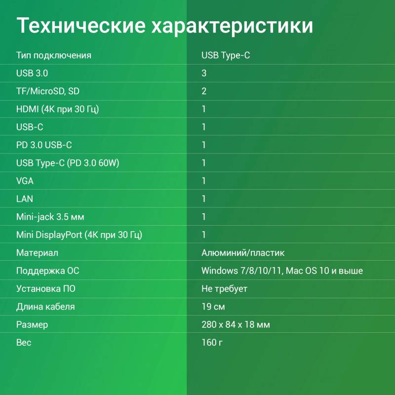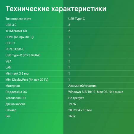 - Mini DisplayPort (4K@30HZ, FULL HD@60Hz). Поддержка карт памяти microSD и SD. Дополнительный порт USB Type-C с поддержкой PowerDelivery 3.0 60Вт. Длина кабеля - 19 см. Не требует дополнительного питания