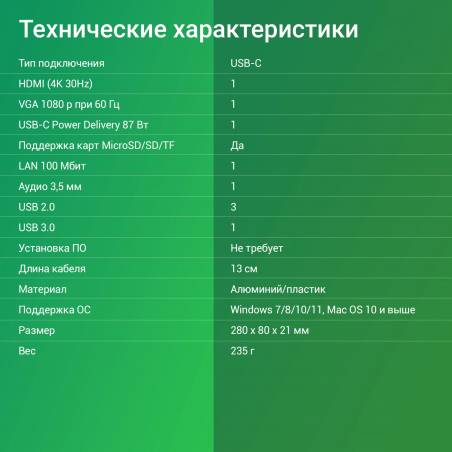 - Type-C док-станция DIGMA, 11 портов (HDMI (4K@30Hz, FULL HD@60Hz) , VGA FULLHD@60Hz, USB-C PD 87W, SD/MicroSD, Lan 100mb, 3.5mm audio, 1xUSB 3.0, 3xUSB 2.0