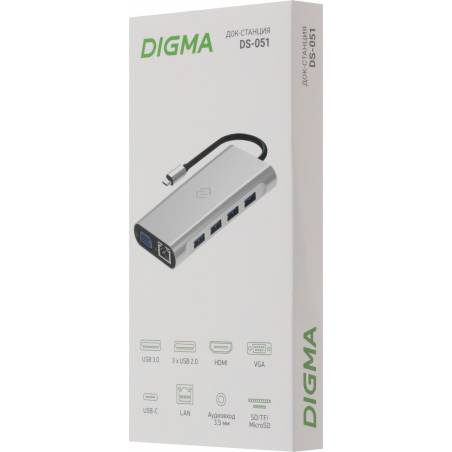 - Type-C док-станция Digma, 11 портов (HDMI (4K@30Hz, FULL HD@60Hz) , VGA FULLHD@60Hz, USB-C PD 87W, SD/MicroSD, Lan 100mb, 3.5mm audio, 1xUSB 3.0, 3xUSB 2.0
