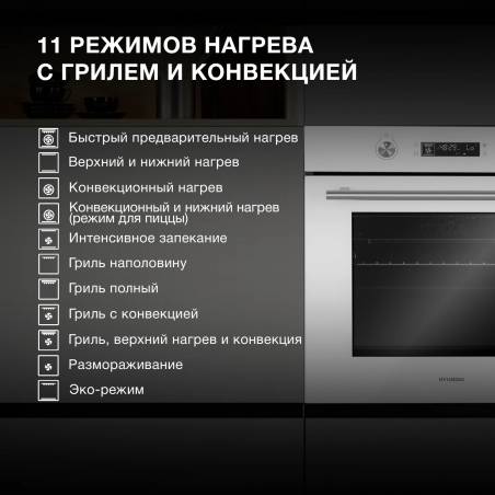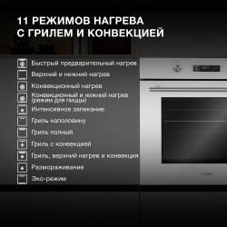 - Размораживание, Предварительный нагрев, Верхний и нижний нагрев, Радиальный нагрев, Радиальный и нижний нагрев, Полугриль, Гриль, Гриль с конвекцией, Гриль, верхний нагрев и конвекция, Эко
