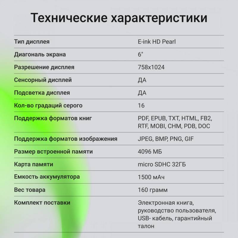 - Электронная книга, руководство пользователя, USB- кабель, гарантийный талон