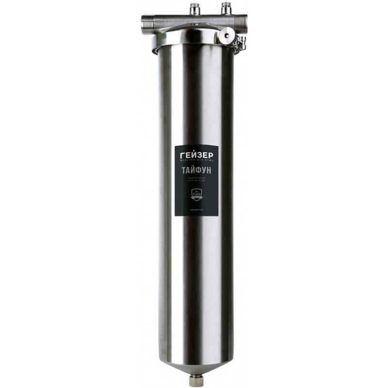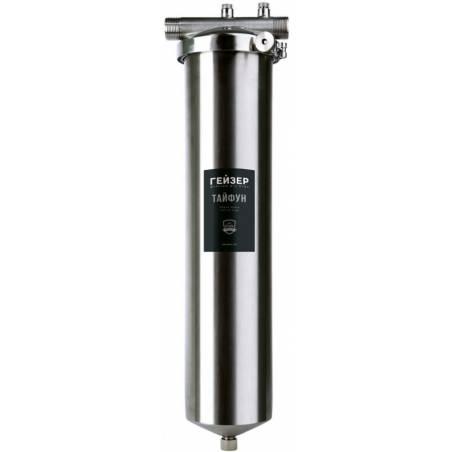 - Корпус и крышка фильтра Гейзер Тайфун 20BB изготовлены из высококачественной нержавеющей стали марки 304L с металлической скобой. Корпус рассчитан на работу под давлением и установку на входе в систему горячего или холодного водоснабжения.