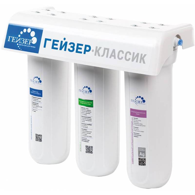 - Трехступенчатый фильтр «Гейзер Классик Комп» для очистки сверхжесткой воды. Признаки сверхжесткой воды: накипь белого цвета в чайнике после первого кипячения, частый белый налет на сантехнике, пленка в чае. Самая совершенная и оптимальная система очис
