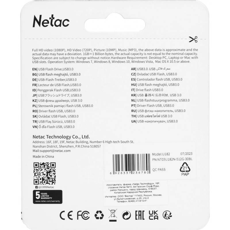 Флеш Диск Netac 512Gb U182 NT03U182N-512G-30BL USB3.0 синий/белый