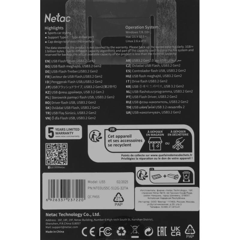 Флеш Диск Netac 512GB US5 NT03US5C-512G-32TA USB3.2 серый