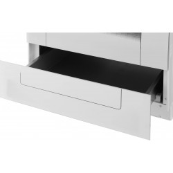 - Стеклянный фасад выдвижного ящика для посуды. Подставка для посуды малого диаметра, противень, решетка.