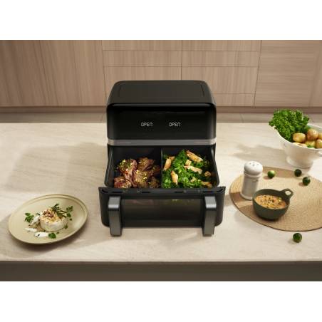 - Гибкая система из двух зон, переключение на одну большую зону приготовления. Две независимые системы нагрева. Цельнометаллический внутренний корпус позволяет избежать запаха пластика во время нагрева. Диапазон температур 40-230°C позволяет приготовить блю