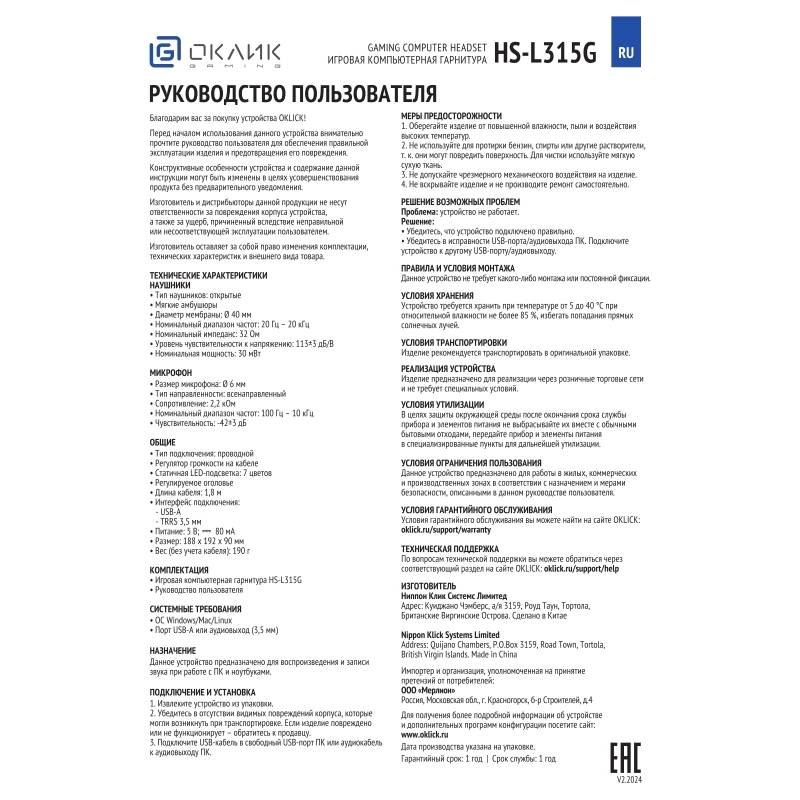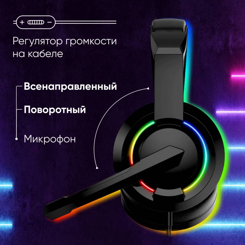Наушники с микрофоном Оклик HS-L315G черный 1.8м накладные USB оголовье (2007552)