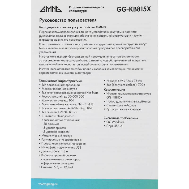Клавиатура GMNG GG-KB815X механическая черный/белый USB Multimedia for gamer LED (1913914)