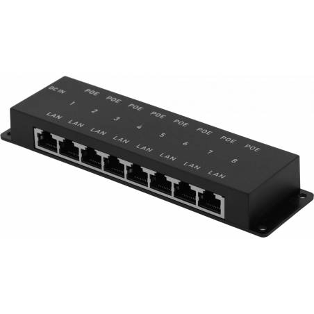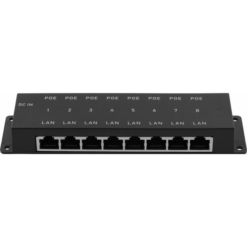 - Пассивный PoE-инжектор Fast Ethernet на 8 портов. Предназначен для питания оконечных сетевых устройств. Напряжение PoE - до 57V(конт. 4,5 (+), 7,8 (-)). Максимальный ток на каждый порт - 650мA.