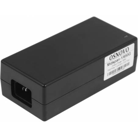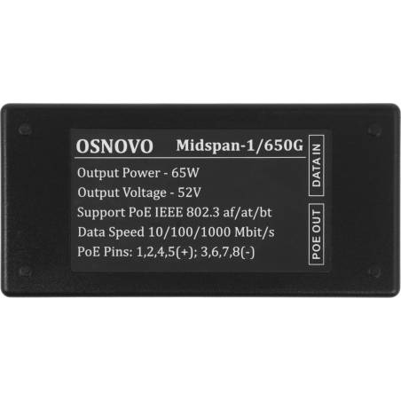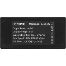 - РоЕ-инжектор Osnovo Midspan-1/650G оснащен входным RJ-45 и выходным RJ-45 с PoE. Скорость передачи — 10/100/1000 Мбит/с. Бюджет РоЕ — 65 Вт.
