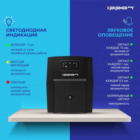 - Светодиодная: 2 шт зеленых – питание от сети, линейный режим; желтый мигающий – питание от аккумулятора; красный – ошибка/низкий заряд аккумулятора. Звуковая: сигнал каждые 10 сек – питание от аккумулятора; 1 сек – низкий заряд аккумулятора; 0,5 с