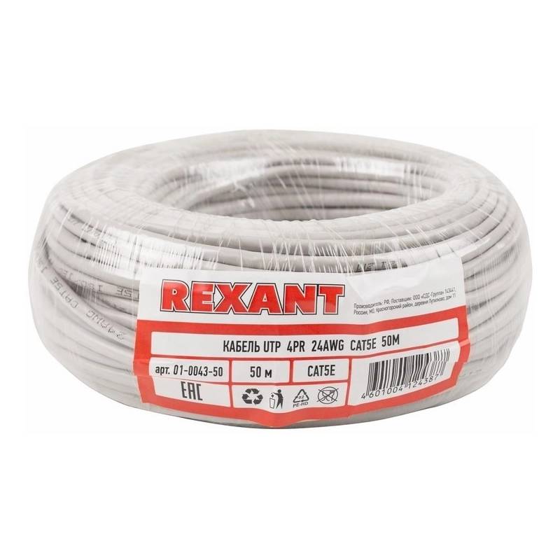 Кабель информационный Rexant 01-0043-50 кат.5E UTP 4 пары 24AWG PVC внутренний 50м серый