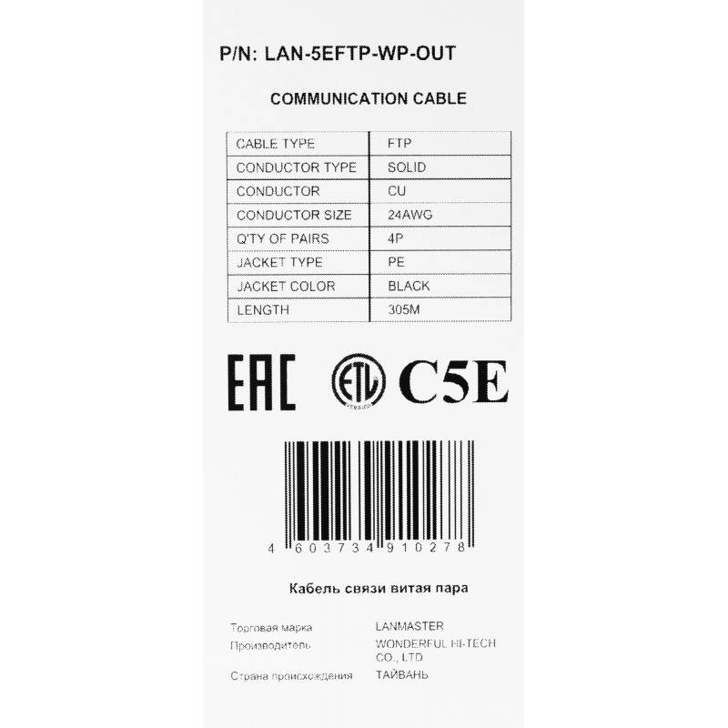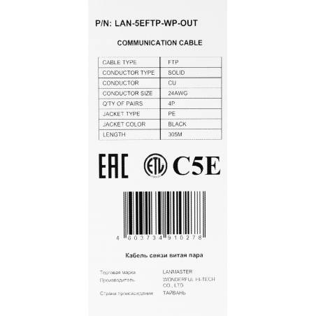 Кабель информационный Lanmaster LAN-5EFTP-WP-OUT кат.5E FTP 4 пары 24AWG PE внешний 305м