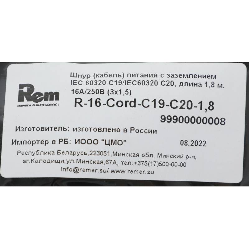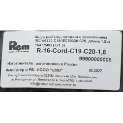 Шнур питания Rem R-16-Cord-C19-C20-1.8 C19-C20 проводник.:3x1.5мм2 1.8м 220В 16А (упак.:1шт) черный