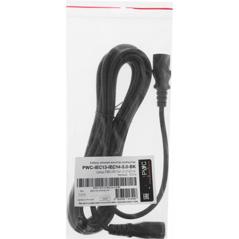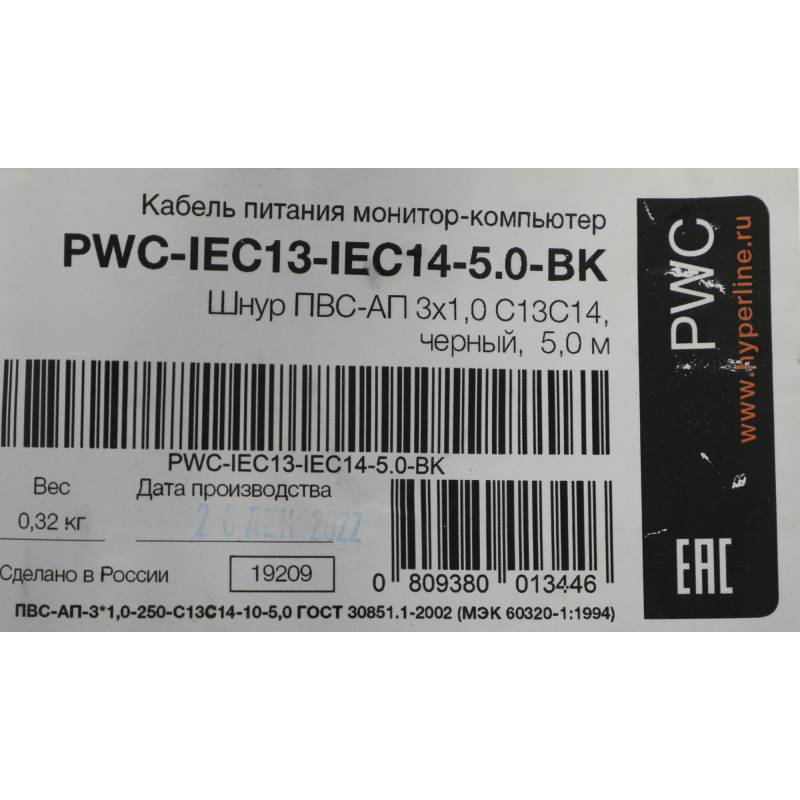 Шнур питания Hyperline PWC-IEC13-IEC14-5.0-BK C13-С14 проводник.:3x1.0мм2 5м 230В 10А (упак.:1шт) черный