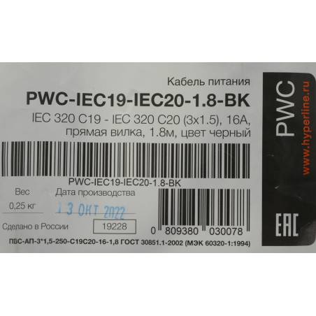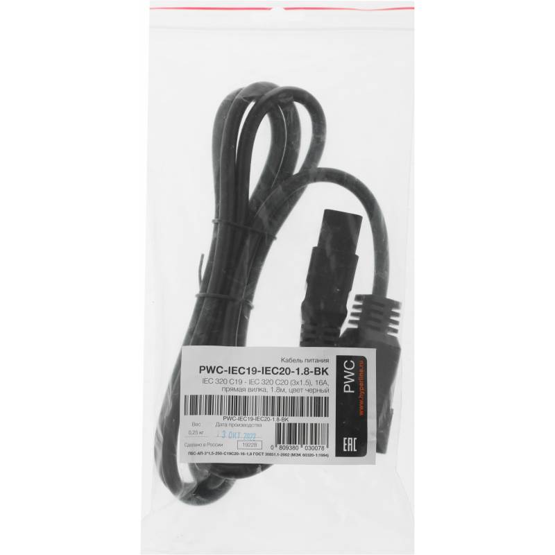 Шнур питания Hyperline PWC-IEC19-IEC20-1.8-BK C19-C20 проводник.:3x1.5мм2 1.8м 250В 16А (упак.:1шт) черный