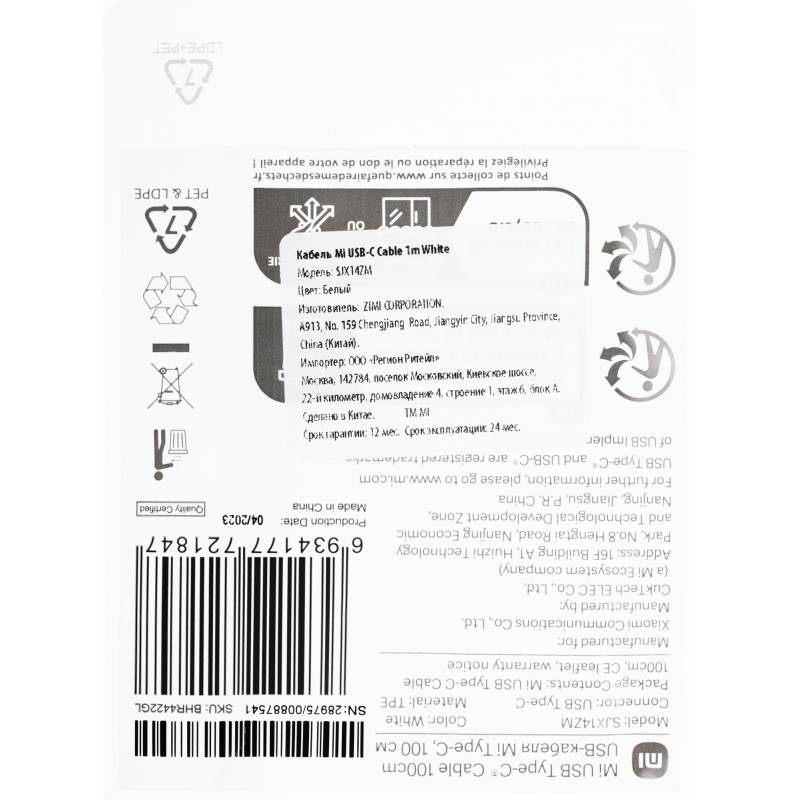Кабель Xiaomi Mi USB Type-C Cable 100cm BHR4422GL USB (m)-USB Type-C (m) 1м белый