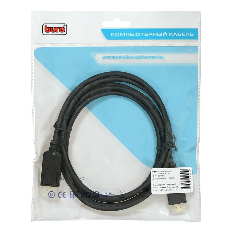 Кабель аудио-видео Buro v. 1.2 DisplayPort (m)/HDMI (m) 2м. позолоч.конт. черный (BHP DPP_HDMI-2)