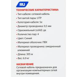 Кабель сетевой Buro BU-CCA-050-BL UTP 4 пары cat.5E solid 0.50мм CCA 305м синий