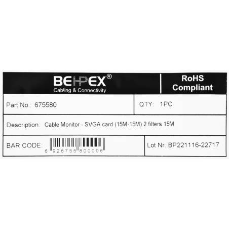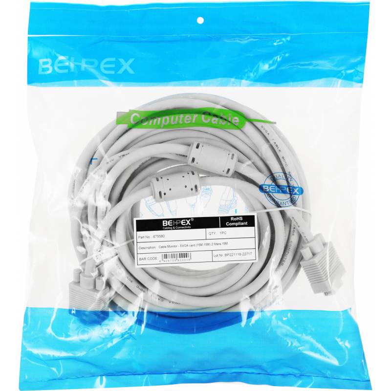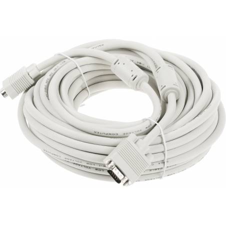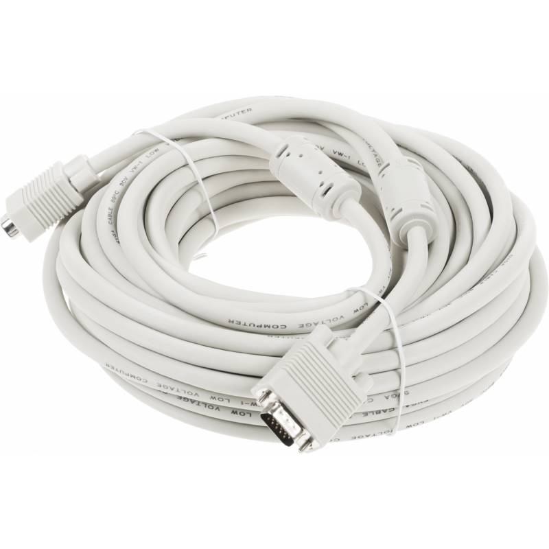 - VGA кабель длиной 15 метров, дающий огромные возможности по размещению оборудования в больших помещениях. Встроенные ферритовые кольца блокируют помехи искажающие идущий по проводу сигнал, таким образом повышая его качество.