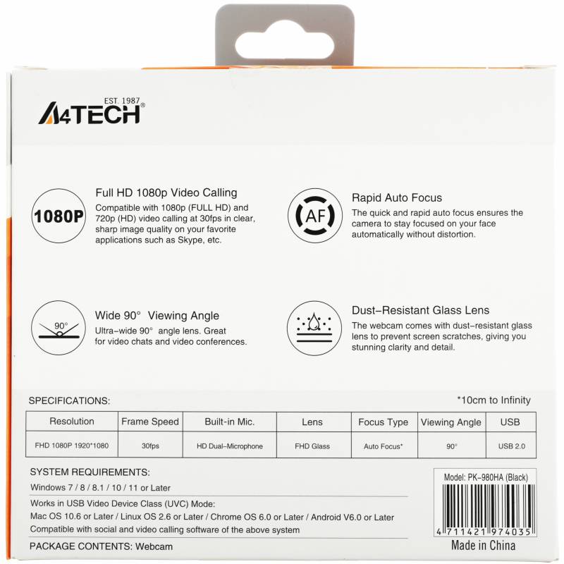 Камера Web A4Tech PK-980HA черный 2Mpix (1920x1080) USB2.0 с микрофоном