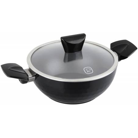 - Материал: утолщенный кованый алюминий. Материал крышки: термостойкое стекло и нержавеющая сталь. Аксессуары: прочная бакелитовая ручка анатомической формы. Преимущества: эргономичная форма ручек; Возможно использование металлических лопато