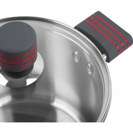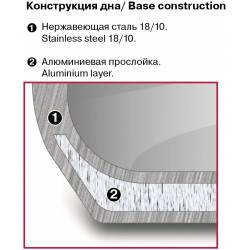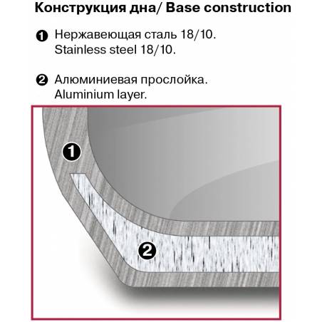 - Технология: тройное вштампованное, а затем вплавленное дно без воздушных полостей. Материал крышки: термостойкое стекло. Аксессуары: комбинированные: бакелит с покрытием Soft Touch с силиконовыми вставками. Преимущества: эргономичная ф
