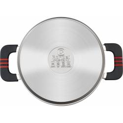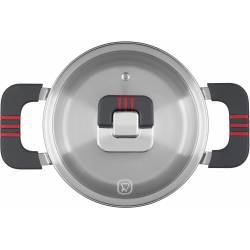 - Технология: тройное вштампованное, а затем вплавленное дно без воздушных полостей. Складная ручка на плоской крышке для экономии пространства при хранении; Силиконовые вставки на ручках против скольжения; Отверстие для выпуска пара; Компактное хранени
