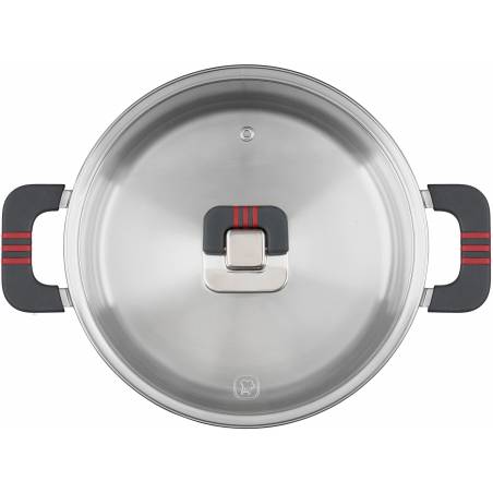 - Технология: тройное вштампованное, а затем вплавленное дно без воздушных полостей. Складная ручка на плоской крышке для экономии пространства при хранении; Силиконовые вставки на ручках против скольжения; Отверстие для выпуска пара; Компактное хранени