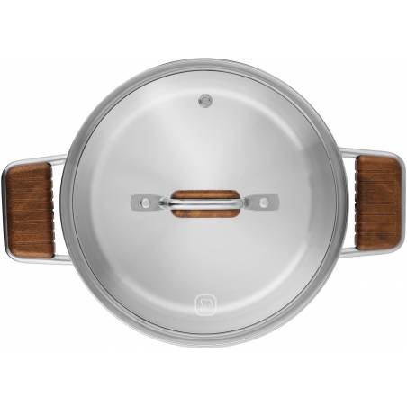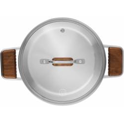 - Технология: тройное вштампованное, а затем вплавленное дно без воздушных полостей. Оригинальная конструкция ручек - комбинация стали и бакелита. Преимущества: эргономичная форма ручек; Плоская крышка из термостойкого стекла с паровыпуском и широк