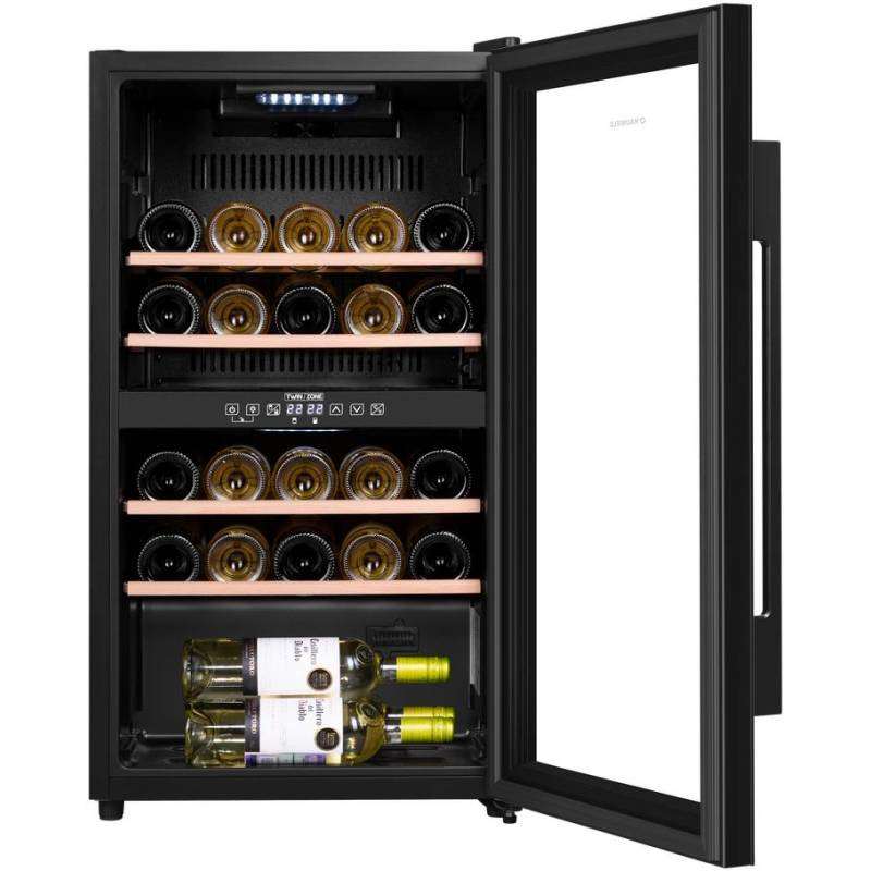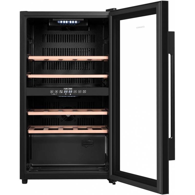 - Шкаф имеет две зоны, для каждой из них можно задать свой режим охлаждения — это актуально для тех, кто планирует хранить дома разные виды напитка: красное, белое, шампанское.
