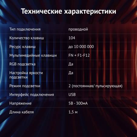 - Ресурс клавиш до 10 000 000 нажатий, Мультимедийные клавиши (FN-F1-F12), 2 режима подсветки: постоянная/пульсирующая, RGB подсветка, настройка яркости подсветки.