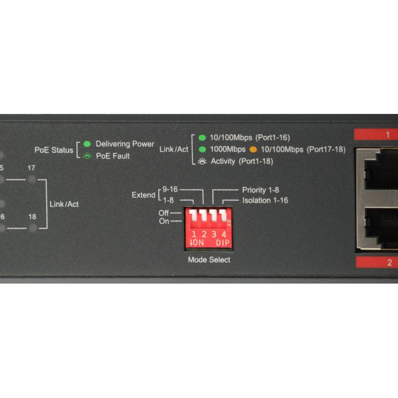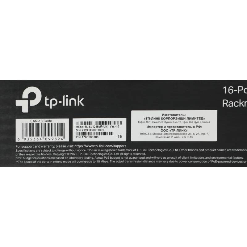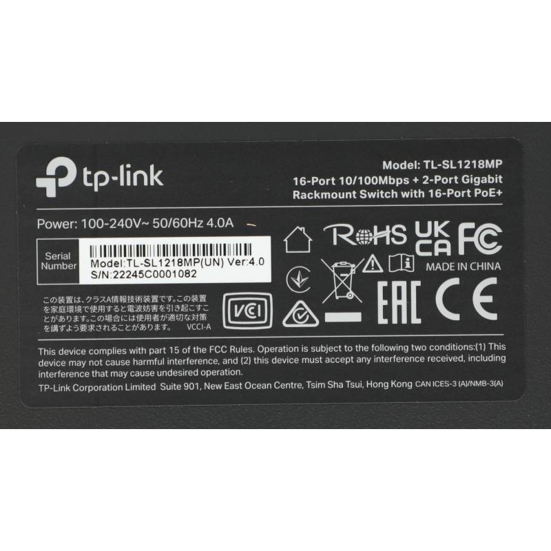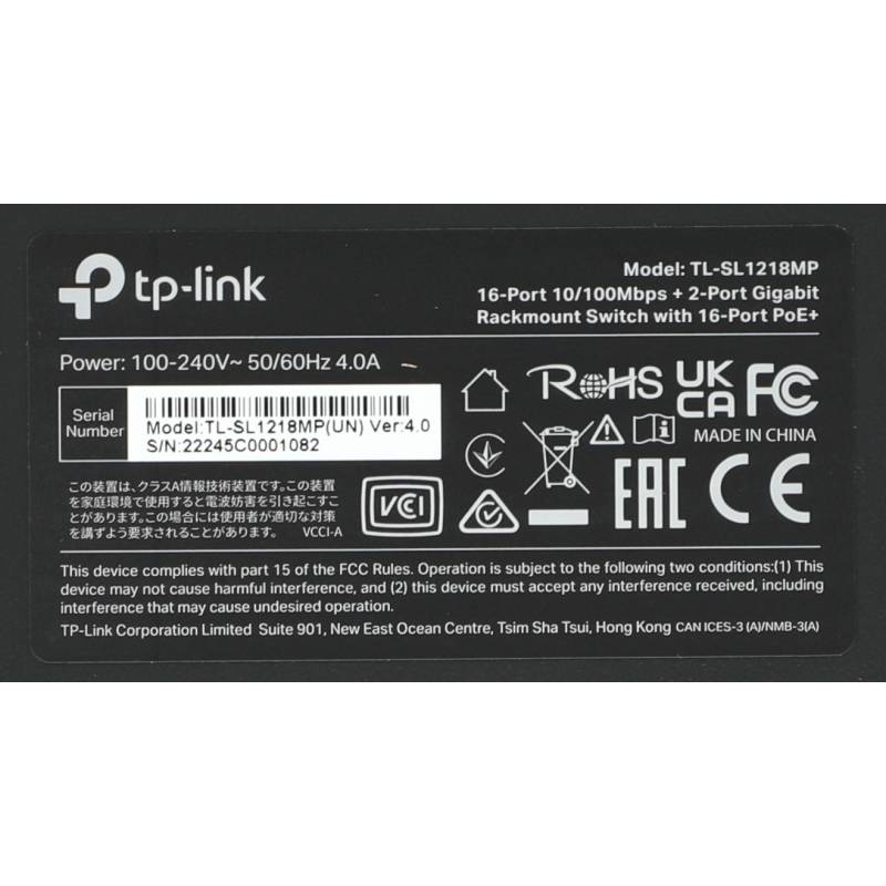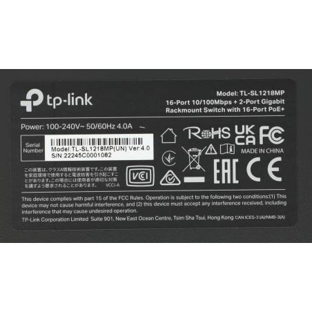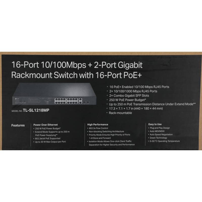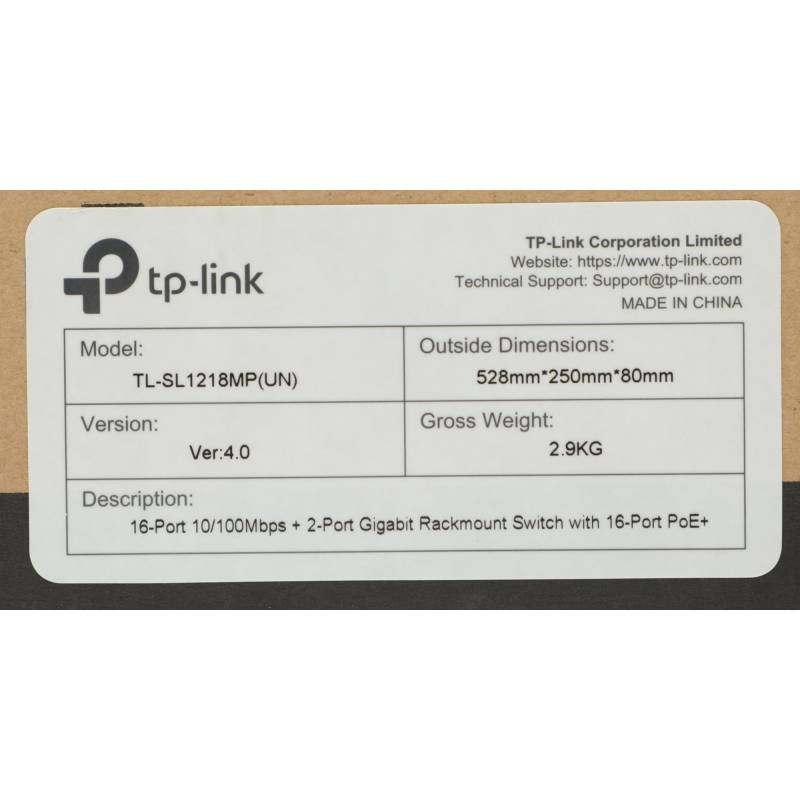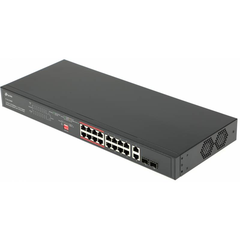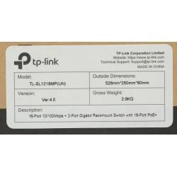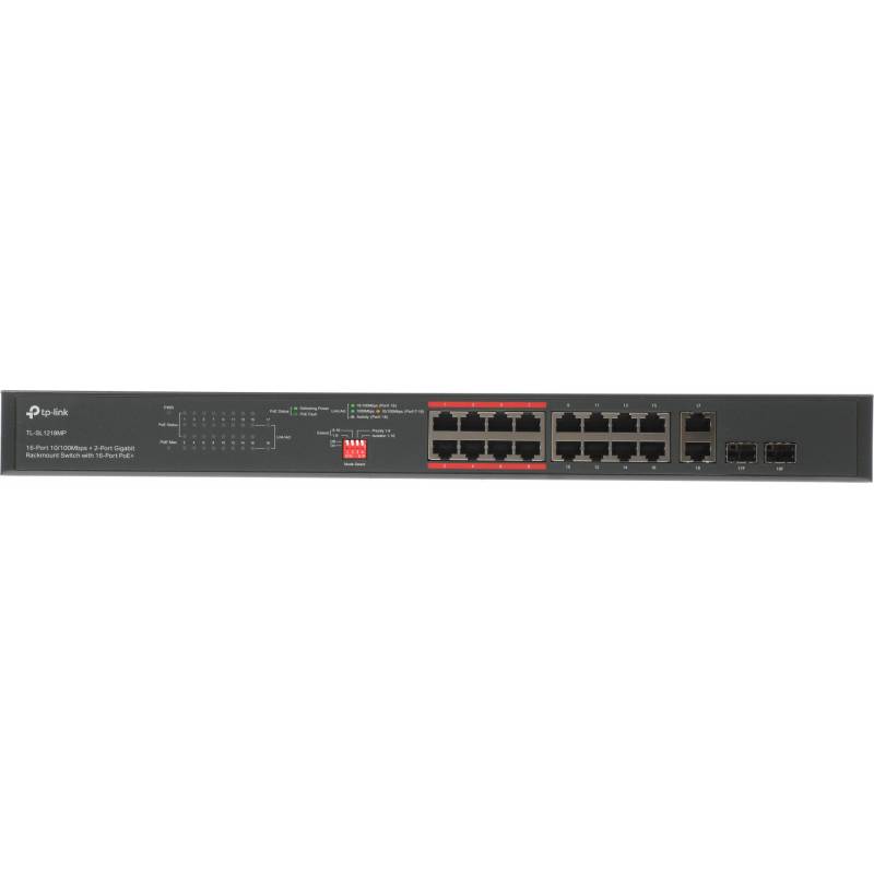 Коммутатор TP-Link TL-SL1218MP (L2) 16x100Мбит/с 2x1Гбит/с 2xКомбо(1000BASE-T/SFP) 16PoE+ 192W неуправляемый