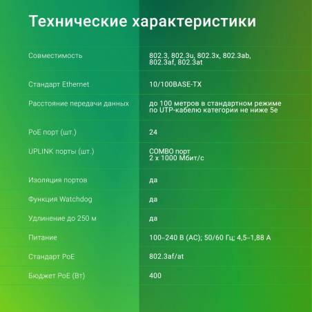- Коммутатор PoE, Крепления для стойки19", кабель питания, гарантийный талон.