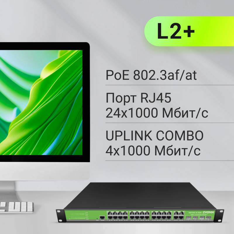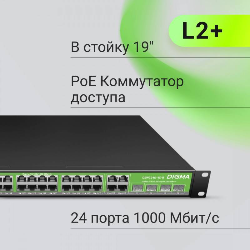 Коммутатор Digma DSP724G-4C-R300 (L2+) 24x1Гбит/с 4xКомбо(1000BASE-T/SFP) 24PoE 24PoE+ 300W управляемый