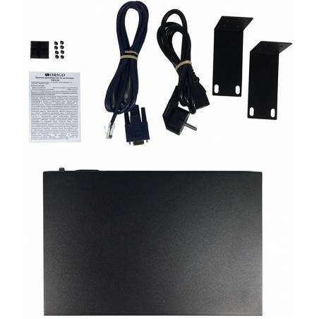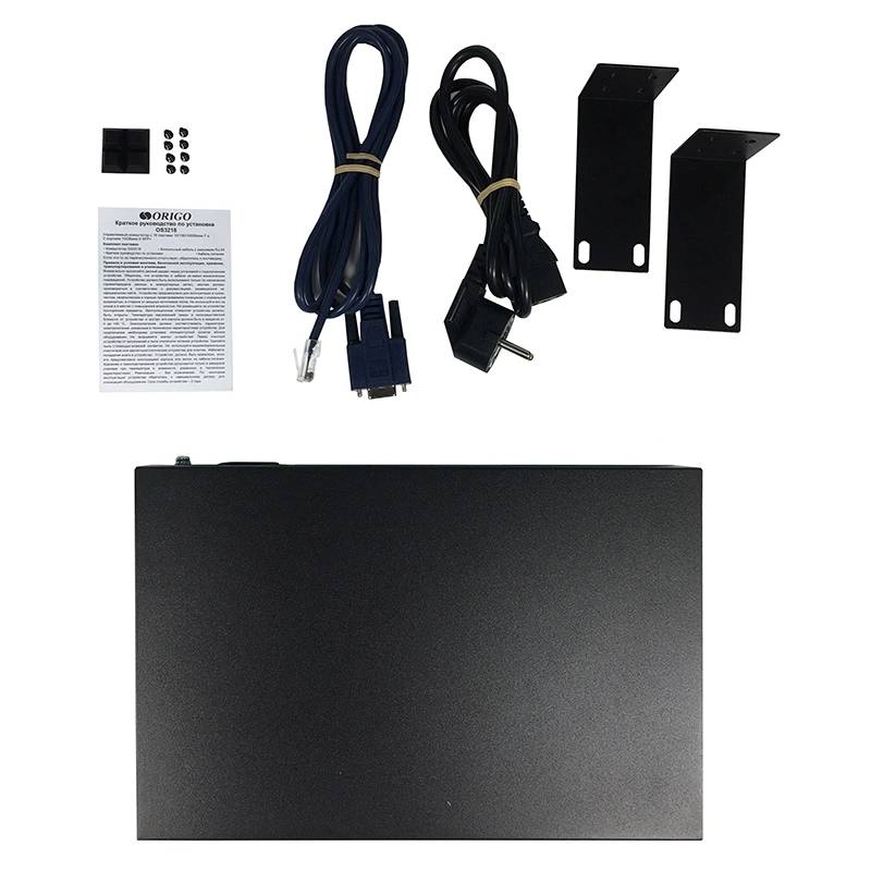 - Коммутатор OS3218, кабель питания, консольный кабель с разъемом RJ-45, комплект для установки в 19-дюймовую стойку, краткое руководство по установке.
