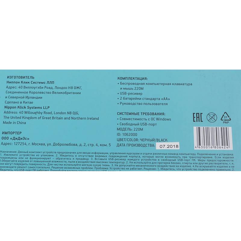 - Беспроводная компьютерная клавиатура и мышь 220М, USB-ресивер.2 батарейки стандарта АА. Руководство пользователя.