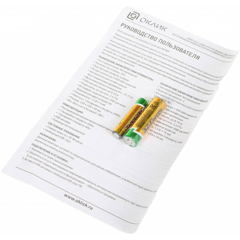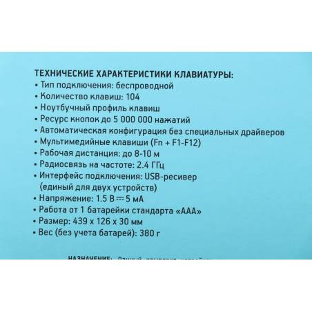 - Беспроводная компьютерная клавиатура и мышь 240M, 2 батарейки стандарта «AAA», 1 батарейка стандарта «AA», USB-ресивер