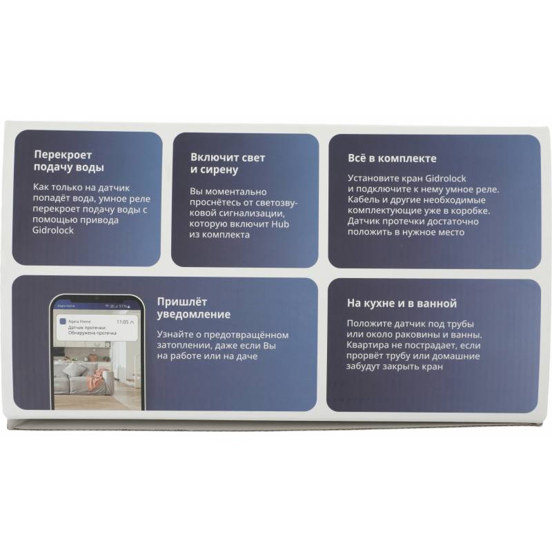 - Aqara SWK43 — набор для подключения системы Умного дома, состоящий из центра умного дома, датчика, фиксирующего протечки, и элементов, необходимых для установки. При срабатывании устройство отключает подачу воды и отправляет уведомление на телефон пользов