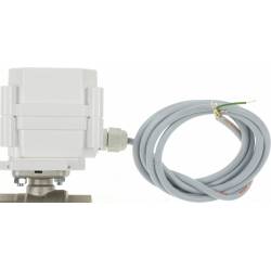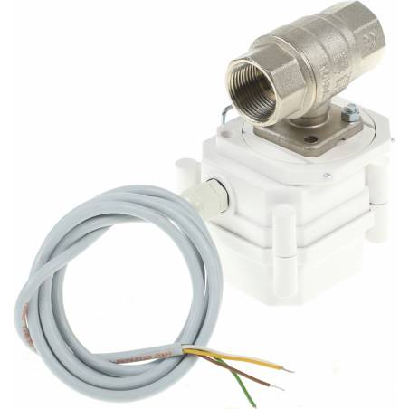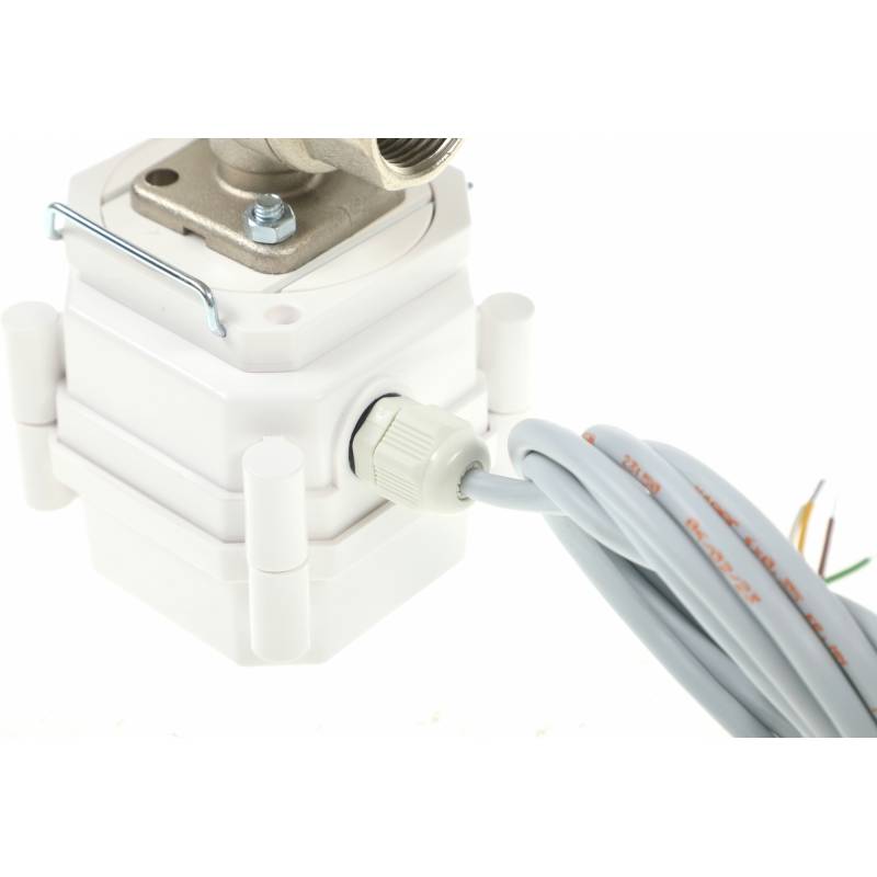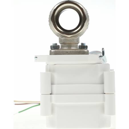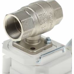 - Электропривод крепится на трубе и соединяется с реле Aqara. Датчик устанавливается на место, которое нужно защитить от протечки. При срабатывании он отправляет информацию шаровому электрокрану, который перекрывает подачу воды.